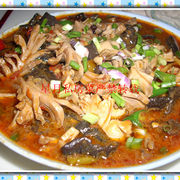 猪肉、牛肝菌、大葱、花椒、食用油、水豆粉、精盐、花椒末、料酒、鸡精。