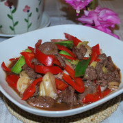 大麋鹿肉、红椒、大葱、葱、蚝油、淡酱油、糖、生粉、水、威士忌、油、盐、黑胡椒粉。