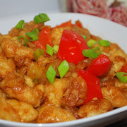 鸡胸肉、罐头菠萝、红菜椒、酱油、葱、蒜、蛋黄、蒜粉、面粉、生粉、水、胡椒粉、盐、油。
