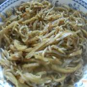 肉丝、饼丝、豆芽、葱、姜、朝天椒、大蒜瓣、盐、茴香、味达美、孜然。