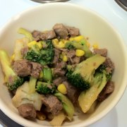 牛肉、白米饭、玉米粒、西兰花、糖、蚝油、胡椒粉、洋葱粉、清水、橄榄油、鲜肉粉。