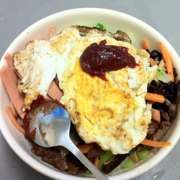 牛肉、米饭、泡菜、胡萝卜、玉米粒、菠菜、生菜、荷包蛋、韩国辣椒酱、油、盐、生抽、冰糖、蜂蜜、黑胡椒、蚝油。
