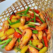 海虾、丝瓜、玉米粒、毛豆、油、盐、料酒、葱、姜、蒜、淀粉、鸡精、鲜抽、胡椒粉、辣椒。