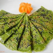 面粉、菠菜渣、鸡蛋、油、盐、葱、鸡精、黑芝麻、胡椒粉。