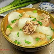 山羊肉、萝卜、盐、料酒、姜、大葱、桂皮、青蒜、鸡精。