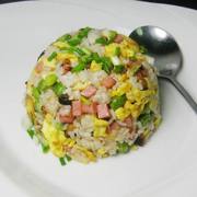 米饭、鸡蛋、豌豆、方腿肠、香菇、油、盐、鸡精、葱。