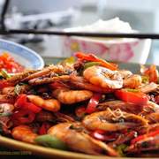 凤尾虾、油、生姜末、花椒、青红辣椒、酱油、料酒、小葱、食盐。