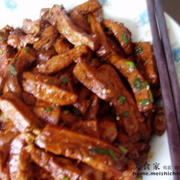 豆干、油、辣椒粉、孜然粉、葱花、熟白芝麻、老抽、鸡精、糖。