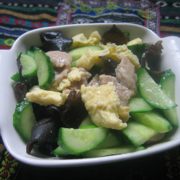 猪肉、黄瓜、鸡蛋、黑木耳、盐、料酒、淀粉、植物油。