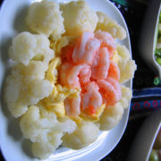 花菜、鸡蛋、虾仁、盐、胡椒粉、淀粉、鸡精、植物油。