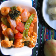 菜花、西蓝花、番茄、草菇、荷兰豆、洋葱、植物油、蒜末、白糖、蚝油、美极鲜味汁。