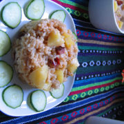土豆、大米、腊肉、黄瓜、姜蒜末、生抽、鸡精、植物油。