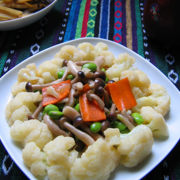菜花、胡萝卜、毛豆、蟹味菇、盐、美极鲜味汁、鸡精、香油、水淀粉、植物油。