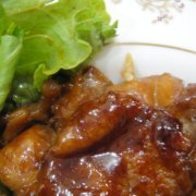 鸡腿、五香粉(腌料)、料酒(腌料)、盐(腌料)、酱油(照烧汁)、料酒(照烧汁)、蜂蜜(照烧汁)。