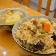 大米、五花肉、红萝卜、豇豆、盐、酱油。