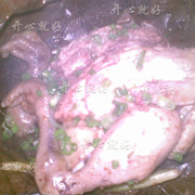 童子鸡、生姜、小葱、蒜头、荷叶、料酒、盐巴、烧烤酱。