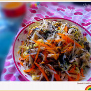 鸡胸肉、绿豆芽、胡萝卜、黄瓜、香菇、黑木耳和银耳、鸡蛋、鸡蛋、芝麻油。