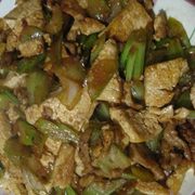西芹、豆腐、肉片、酱油、盐、味精、淀粉、油、葱花、蒜末。
