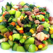 黄瓜、瘦肉、什锦玉米粒、水淀粉、葱姜蒜、盐、鸡精。