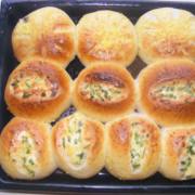 高筋面粉、细砂糖、奶粉、椰奶粉、鸡蛋、温水、蛋液、香葱丝、芝士、胡萝卜粒、盐、酵母粉、菜籽油。