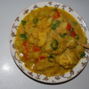 鸡腿、土豆、彩椒、洋葱、菜油、姜、咖喱粉、椰奶。