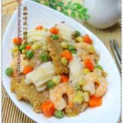小米饭、鱿鱼、虾仁、胡萝卜粒、豌豆粒、熟玉米粒、葱姜末、盐、鸡精、糖、鲍鱼汁、水淀粉、植物油、高汤。