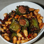 尖椒、肉馅、黄飞鸿麻辣花生、葱、姜、料酒、生抽、盐、花生油。