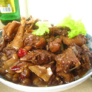 焯水鸭肉、花生、葱、姜丝、蒜片、辣椒、生抽、老抽、料酒、啤酒、盐。