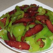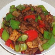 鲜猪肉、青红椒、香干、老干妈香辣酱、酱油、糖、味精。