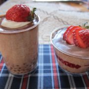 牛奶、奶油、苦甜巧克力、6分发的鲜奶油、西谷米、吉利丁、草莓、鲜奶油、巧克力、细砂糖。