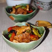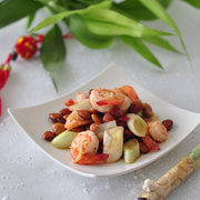 虾、杏仁、葱、蒜、姜、辣椒粉、肉汤、湿淀粉、盐、白糖、醋、酱油。