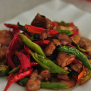 五花肉、彩椒、盐、鸡精、胡椒粉、酱油、料酒、葱姜蒜。