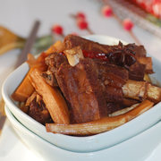 茭白、排骨、葱姜、红尖椒、酱油、料酒、盐、胡椒粉、冰糖、花椒、大料。