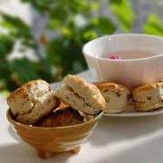 低筋面粉、全蛋液、牛奶、蔓越莓干、细砂糖、盐、黄油、泡打粉。