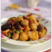 香菇、杏鲍菇、豆腐果、花生仁、毛豆仁、蚝油、盐、鸡精、白糖少许、胡椒粉、色拉油、香油、葱姜蒜、红尖椒。