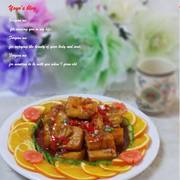 豆腐、青红椒、胡萝卜、蒜末、番茄酱、醋、蚝油、盐、白糖、蜂蜜、香油。