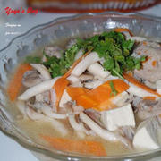秀珍菇、豆腐、胡萝卜、肉丸、香菜、盐、鸡精、胡椒粉、香油、香油。