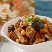 黄花菜、烤麸、木耳、香菇、花生、莲子、腐竹、白菜帮、八角、桂皮、盐、鸡精、冰糖、香油、酱油、蚝油、葱、姜、蒜。