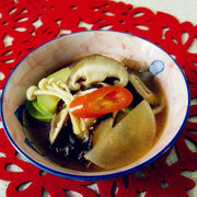 金针菇、肉片、小瓜、白萝卜、蘑菇、洋葱、昆布、鱼干、姜丝、青辣椒、红辣椒、大葱、蒜泥。