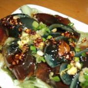 皮蛋、黄瓜、青椒、香葱、蒜末、陈醋、生抽、辣椒油、盐、麻油。