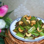 香芹、腰果、精肉、油、盐、味极鲜、葱、姜。