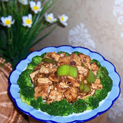 卤水豆腐、西兰花、青椒、油、盐、豆瓣酱、葱、姜。