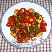 洋葱丝、鸡蛋、红辣椒圈、香菜、油、盐、酱油。