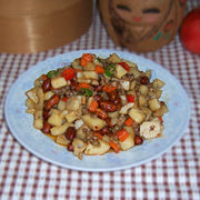 藕、胡萝卜、青红椒、花生、肉末、油、盐、郫县豆瓣酱、白糖。