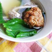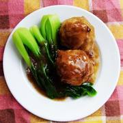 油面筋、猪肉糜、香葱、生姜、小油菜、鸡蛋、盐、醋、生抽、淀粉、蚝油、鸡精、麻油、食用油。
