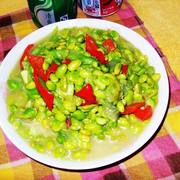 丝瓜、毛豆、红椒、葱、姜、盐、鸡精、食用油。