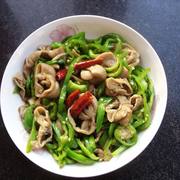 熟猪肠、青椒、大葱、生姜、蒜瓣、红尖椒、醋、料酒、生抽、盐、糖、鸡精、食用油。