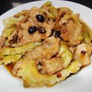 猪带皮五花肉、白苦瓜、葱、姜、蒜、料酒、醋、盐、鸡精、食用油、老干妈豆鼓、生抽。