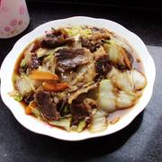 带筋熟牛肉、大白菜、胡萝卜、葱、姜、蒜、食用油、蚝油、生抽、糖。