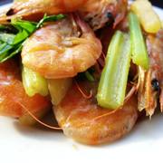 对虾、西芹、小土豆、食用油、葱、姜、蒜、盐、生抽、鸡精。